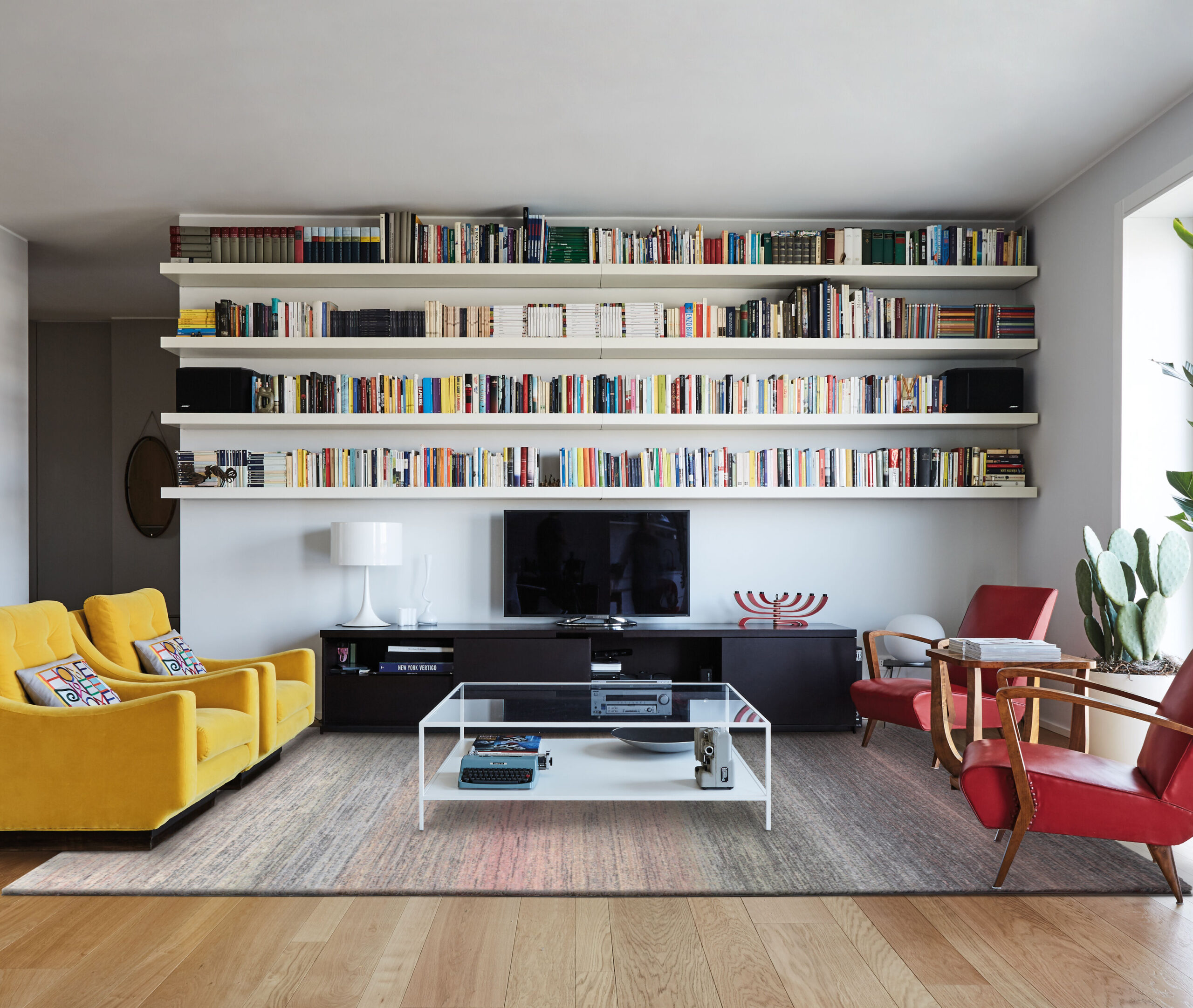 Minimalizm w czystej formie bywa nudny. Białe ściany, szara sofa, proste lampy… i nagle kolorowy dywan. Jeden element zmienia wszystko. Niby minimalizm zostaje, ale pojawia się osobowość.
